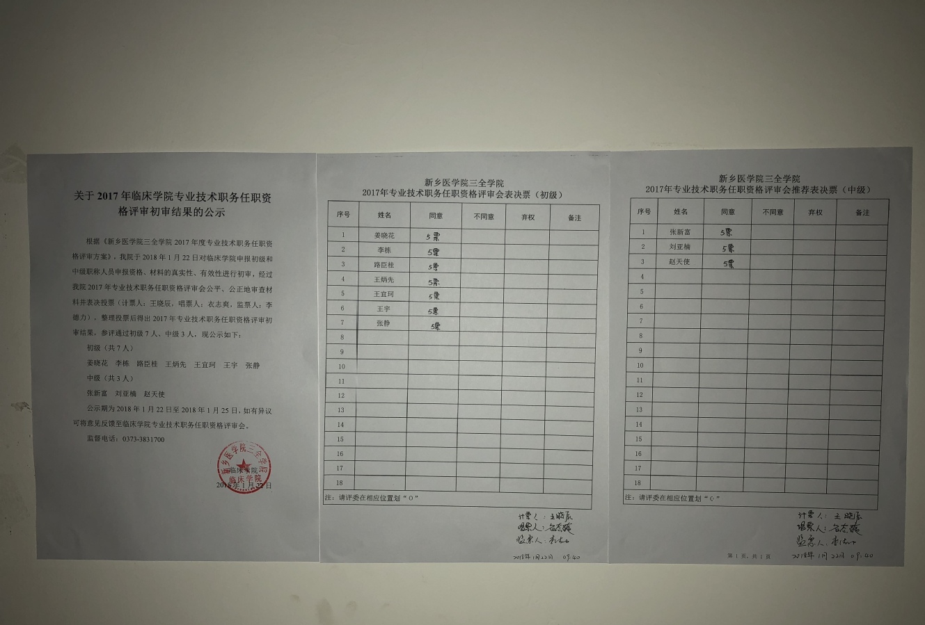 根据《新乡医学院三全学院2017年度专业技术职务任职资格评审方案》,我院于2018年1月22日对临床学院申报初级和中级职称人员申报资格、材料的真实性、有效性进行初审,经过我院2017年专业技术职务任职资格评审会公平、公正地审查材料并表决投票(计票人:王晓辰,唱票人:衣志爽,监票人:李德力),整理投票后得出2017年专业技术职务任职资格评审初审结果,参评通过初级7人、中级3人,现公示如下: