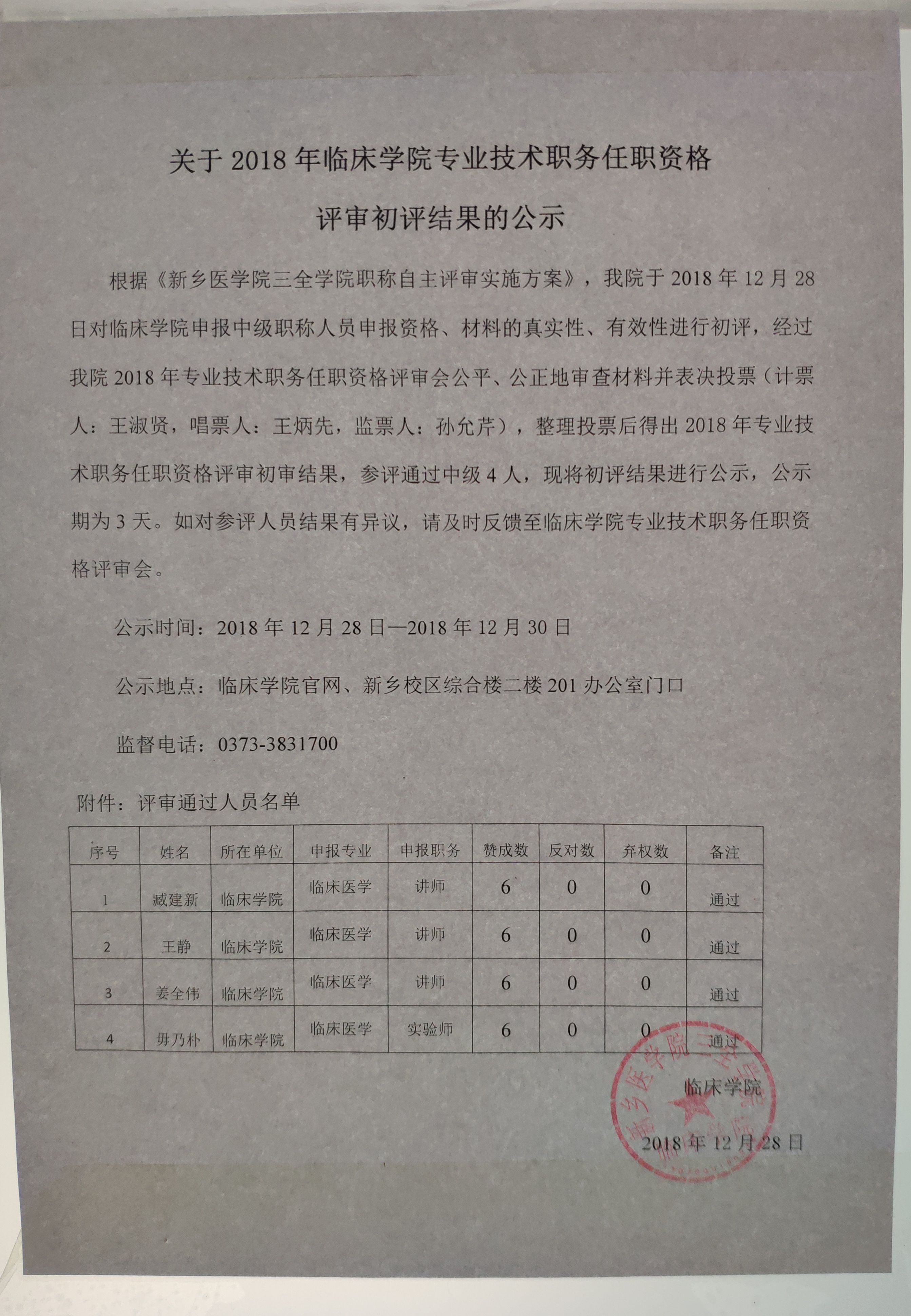 根据《新乡医学院三全学院职称自主评审实施方案》,我院于2018年12月28日对临床学院申报中级职称人员申报资格、材料的真实性、有效性进行初评,经过我院2018年专业技术职务任职资格评审会公平、公正地审查材料并表决投票(计票人:王淑贤,唱票人:王炳先,监票人:孙允芹),整理投票后得出2018年专业技术职务任职资格评审初审结果,参评通过中级4人,现将初评结果进行公示,公示期为3天。如对参评人员结果有异议,请及时反馈至临床学院专业技术职务任职资格评审会。