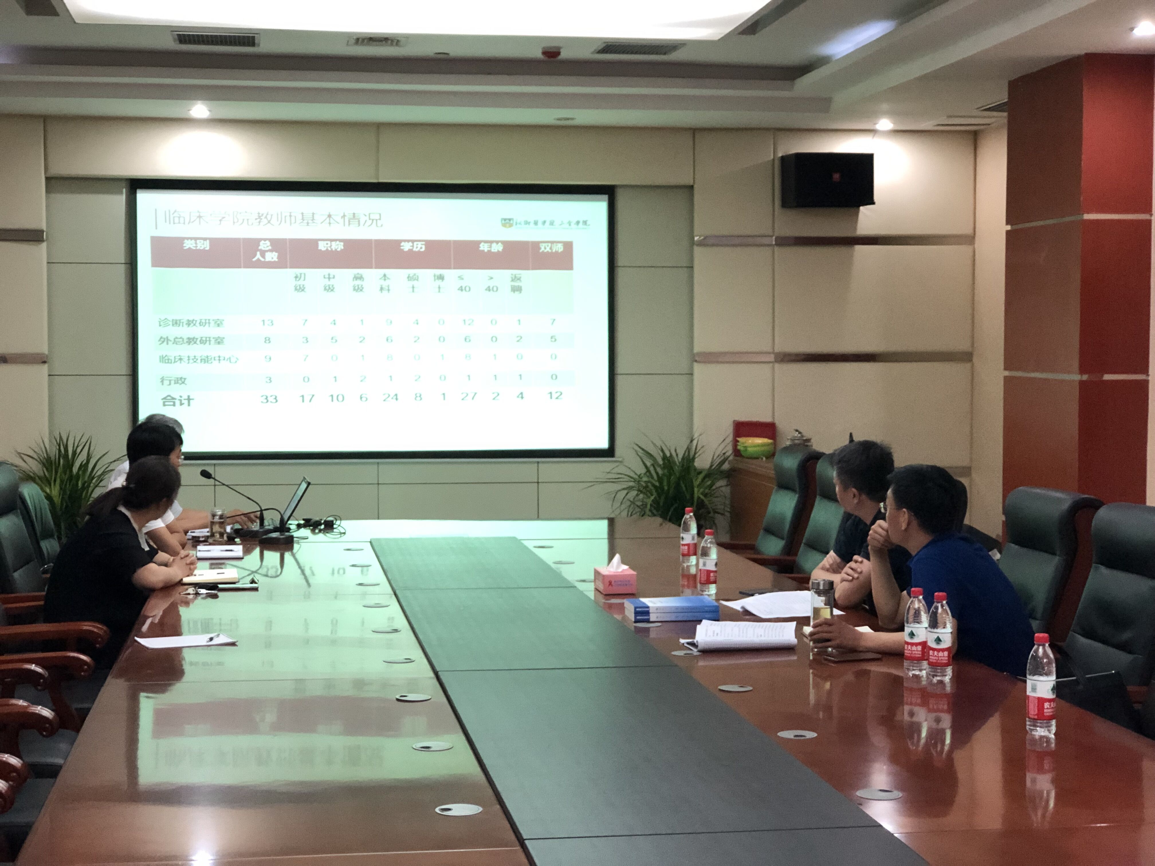 路成吉从党建基本情况、教学工作两大部分进行汇报,在教学工作部分围绕学院基本情况、工作回顾与成效、存在问题与困难、发展谋划与思路、意见与建议、执业医师考试情况等六个方面逐一进行阐述。同时就达到国家《临床医学专业本科教学标准》及围绕一流学科提高教学质量方面做了汇报。