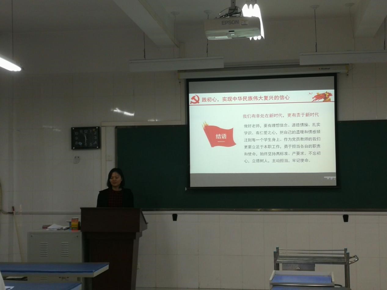 本次党课由教工第二支部书记王淑贤同志主讲,从“什么是初心、悟出心、守初心、践初心”四个方面进行了学习。她强调“行程万里,不忘来路,初心如磐,使命在肩”。在平凡而责任重大的教师岗位上,大家必须要懂初心、明初心,让初心永驻心头,进而在践行初心的过程中,担使命、找差距、抓落实。在教书育人践初心过程中,首先,以德施教,以德立身。其次,积累学习,及时更新教育理念。活到老、学到老,做党和人民满意的新时代人民教师。