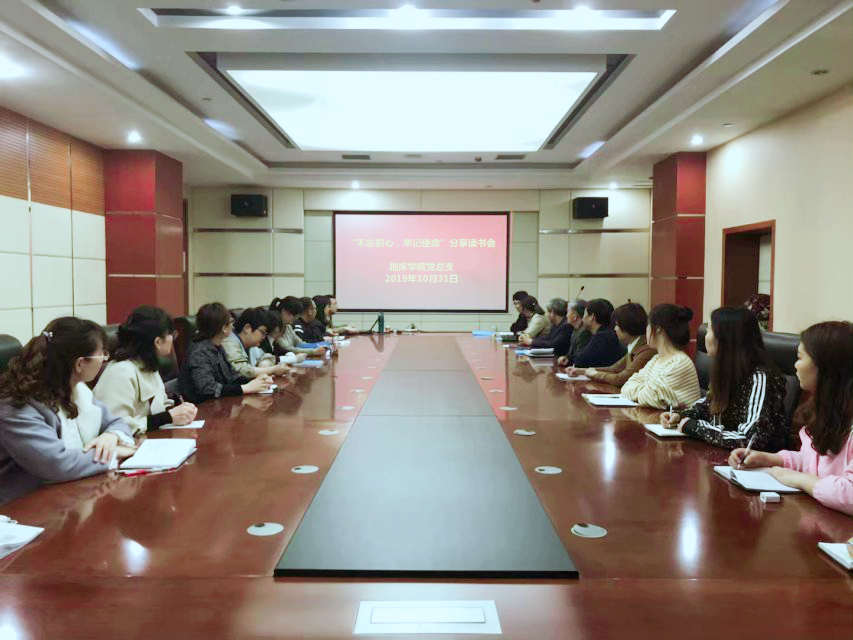 为传达习近平总书记在不忘初心、牢记使命主题教育工作会议上的重要讲话,建设学习型党组织,10月31日晚,临床学院党总支于综合楼二楼会议室召开“不忘初心,牢记使命”读书分享会,由临床学院院长路成吉带领大家共同学习《习近平新时代中国特色社会主义思想学习纲要》一书,临床学院全体教师参加。