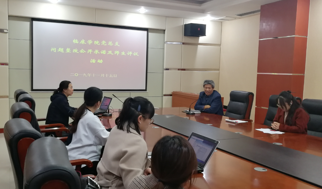 11月15日晚,临床学院党总支于综合楼二楼会议室开展 “问题整改公开承诺及师生评议”活动,开展“旧账清零”行动, 从检视反思的问题、师生反映强烈的9项问题中,选取2项结合师生反映强烈的问题、在主题教育期间能够解决的问题,抓紧整改解决。会议由临床学院院长路成吉主持,临床学院全体教师参加。