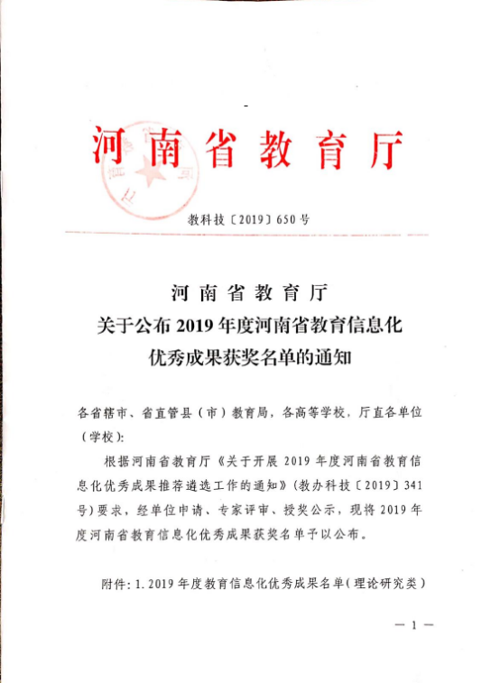学校根据河南省教育厅《关于开展2019年度河南省教育信息化优秀成果推荐遴选工作的通知》(教科技〔2019〕341号)安排,学校在校内发布申报通知,积极组织各单位申报共提交13项成果。