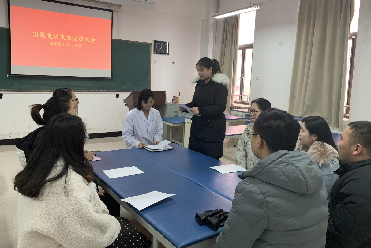 12月12日,临床教工第二支部在问学楼四楼第七实验室召开预备党员接收大会,该会由教工二党支部书记王淑贤同志主持,该支部全体党员同志、被发展对象参与此次议会。大会围绕接收发展对象王炳先同志成为预备党员,通过大会讨论并决定发展对象的入党问题。