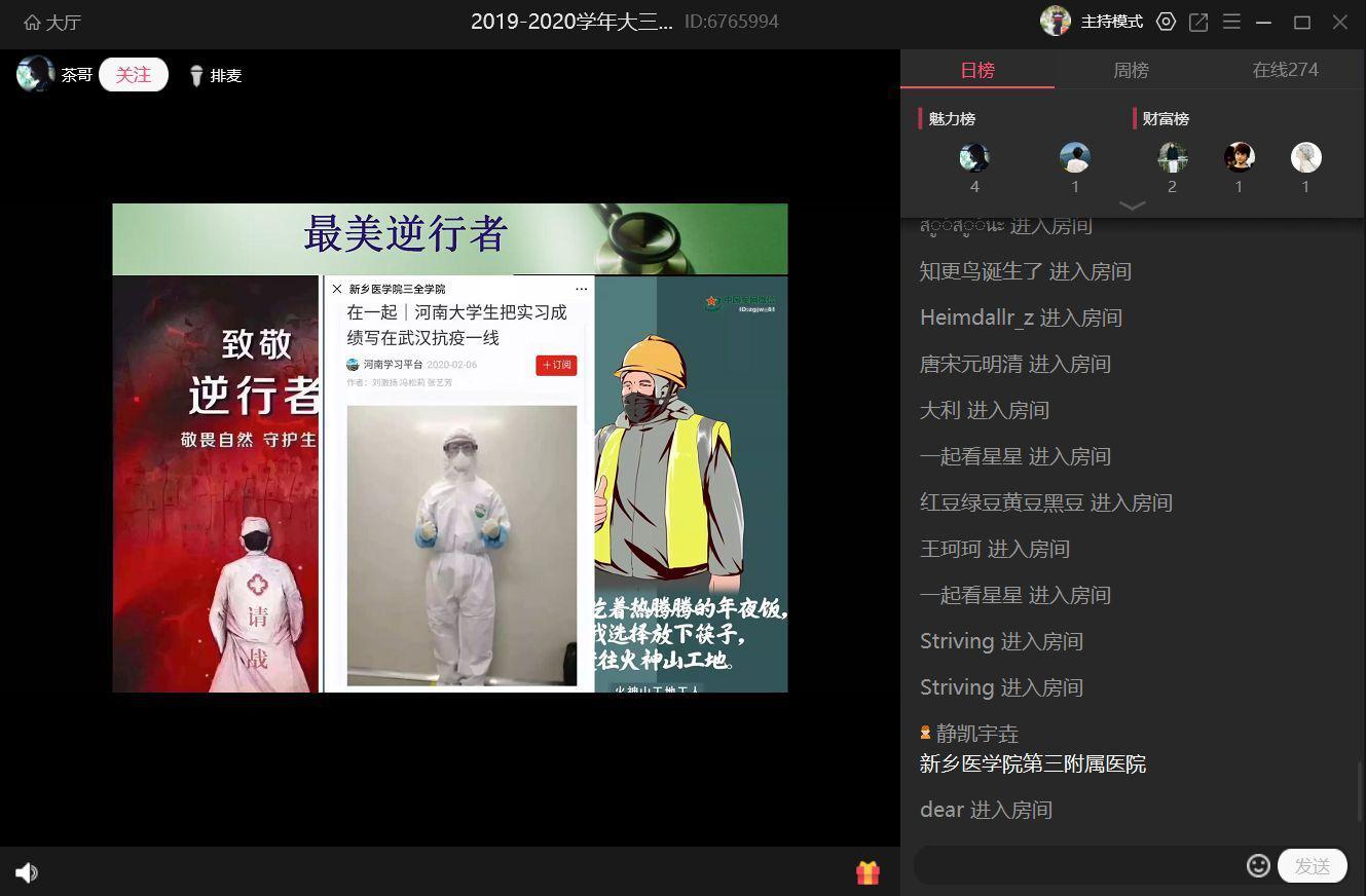 到今天为止,诊断学已经完美完成4次直播间授课,他们的直播间声音干净,画面清晰,学生满勤,发言积极踊跃,师生互动良好,并且很好的融入与当前疫情相关的课程思政,课后作业也同样设置预防新型冠状病毒的选择题增加学生的防范意识,他们采用的QQ直播间网络授课的方式和内容受到广大教师和学生的一致好评。为我院其他课程的开展起到很好的借鉴和示范作用。