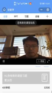 到今天为止,诊断学已经完美完成4次直播间授课,直播间声音干净,画面清晰,学生满勤,发言积极踊跃,师生互动良好,并且很好的融入与当前疫情相关的课程思政,课后作业也同样设置预防新型冠状病毒的选择题增加学生的防范意识,教师们采用的QQ直播间网络授课的方式和内容受到广大教师和学生的一致好评。为临床学院其他课程的开展起到很好的借鉴和示范作用。