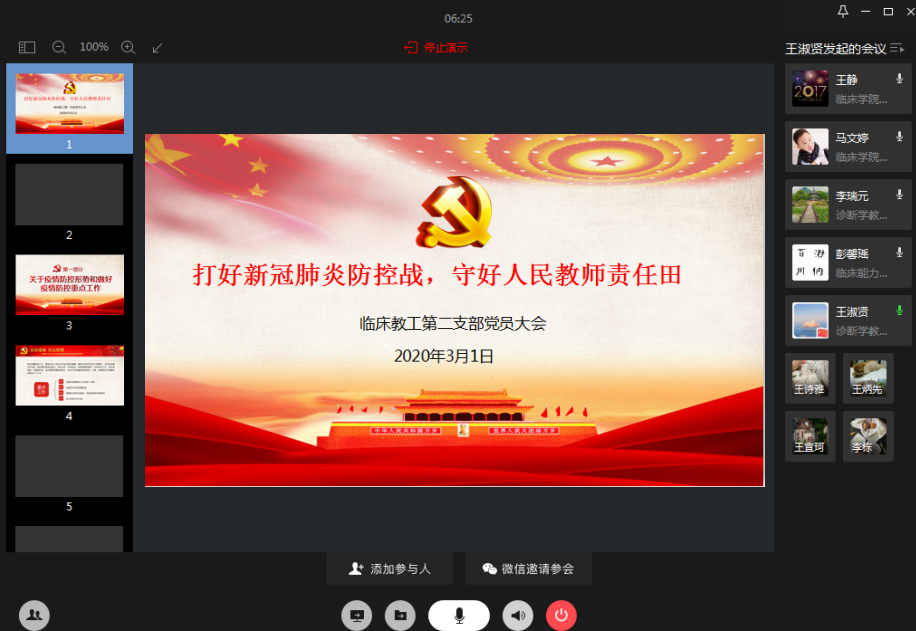 3月1日,临床学院教工第二支部全体党员通过企业微信语音会议的形式,召开新学期支部党员大会。会议由支部书记王淑贤同志主持。