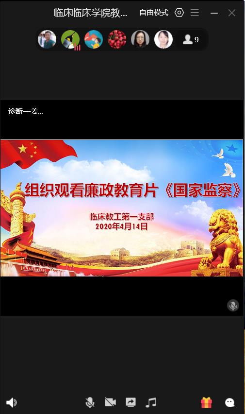 为进一步增强全体党员廉洁自律意识,推动学校党风廉政建设和反腐败工作向纵深发展,根据学校工作安排,4月14日临床教工第一支部通过QQ群课堂的形式组织党员同志观看反腐倡廉教育纪录片《国家监察》之《全面监督》。