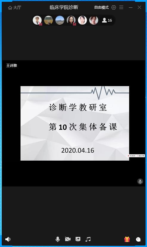4月16日上午,临床学院诊断学教研室使用QQ直播间开展了本学期第五次线上预试讲和第十次集体备课,教研室副主任谢静主持,全体教师和教辅参加了本次教学活动。