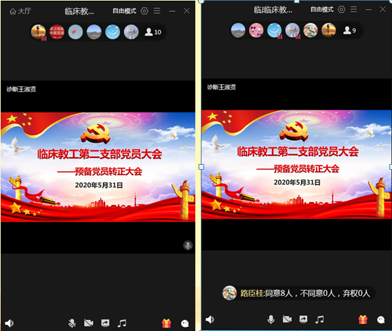 为加强党风建设,提高党员素质,5月31日下午,由于疫情隔空影响,临床教工第二支部在线上召开了预备党员转正会议。会议由党支部副书记王淑贤主持,教工第二支部正式党员8名和预备党员3名参加了此次会议。