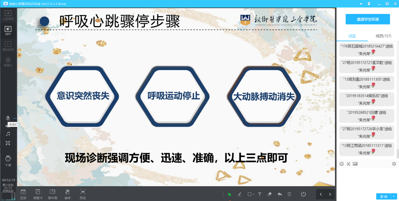 活动伊始,朱光举为同学们播放演讲视频《后浪》,鼓励同学们作为新一代青年,要有正向开放的心态,面对当前疫情的影响,更要学好基础知识,展现出青年一代积极向上的一面。随后朱光举结合多媒体,运用自己的专业知识,与大量医疗实例,从心肺复苏的操作要点、注意事项、并发症的处理方法等方面进行了讲解,强调了当心脏停跳后大脑皮层能够耐受的存活时间只有4-6分钟,之后便开始不可逆的死亡进程,这个时间窗被称为“黄金4分钟”。对于心脏骤停的患者,必须由第一目击者在现场开始进行有效的心肺复苏抢救。心脏骤停,必须第一时间进行心肺复苏的抢救。这项被称为第一救命术的心肺复苏技术,多是在医学院和医院内部实施,医院外公众普及率很低,每天仍有很多患者因得不到及时正确的心肺复苏而失去抢救时间。他告诉同学们要普及心肺复苏知识,让更多的人掌握这项急救技能,对于提高猝死患者的抢救率十分必要。