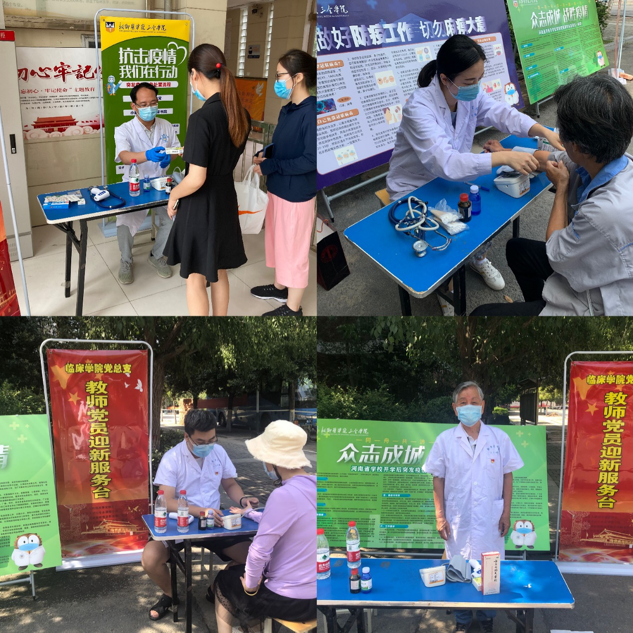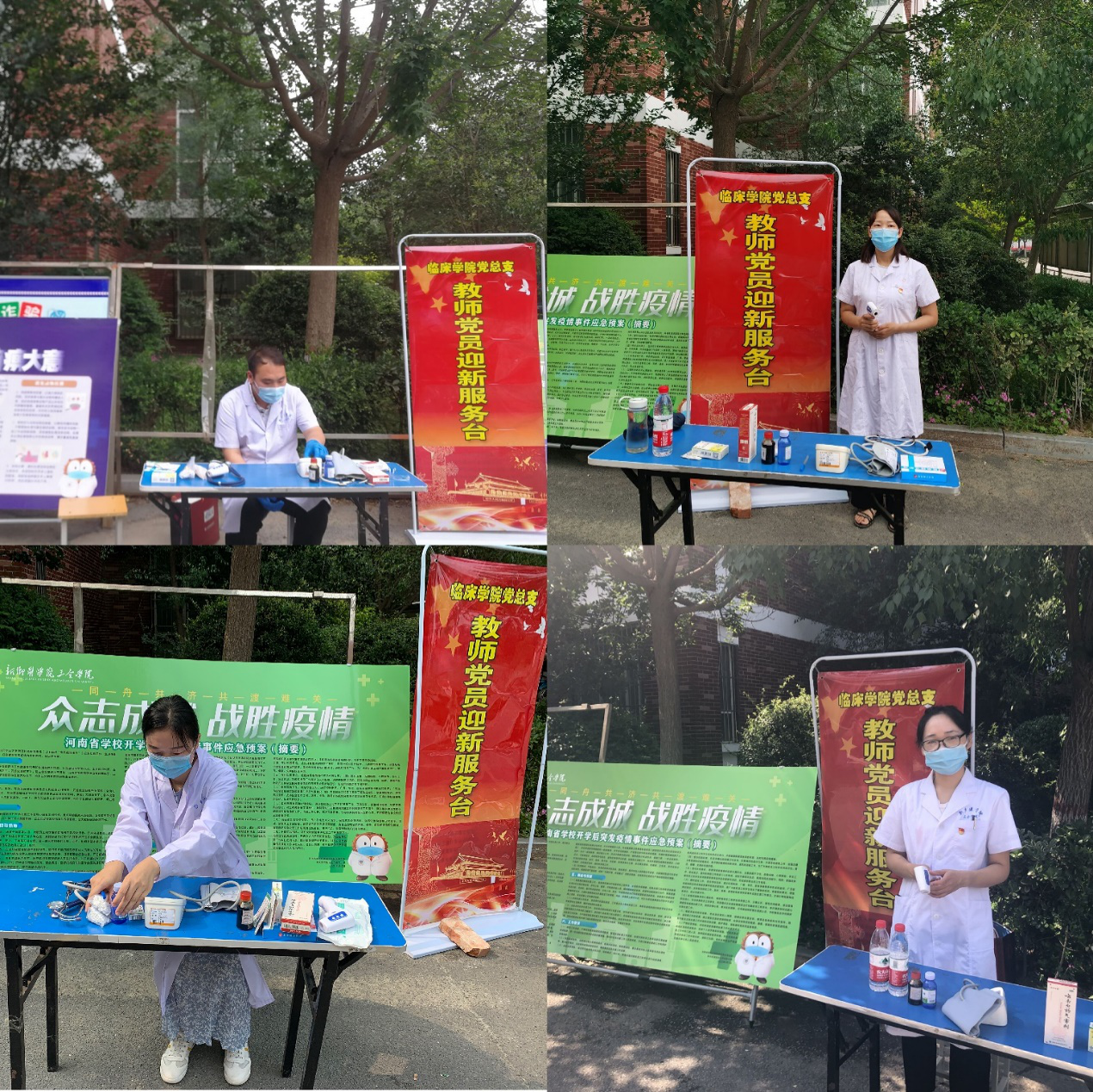7月1日是党的生日,也是参加今年专升本考试学生返校的第一天。由于在疫情防控特殊时期,我校今年的专升本考试准备工作比以往要求的更加严谨和细致。临床学院党总支的全体党员教师主动要求参与学校疫情防控志愿工作,于7月1日至7月9日,在学生公寓楼前设立党员教师志愿服务台,每日轮流值班,给学生测体温、提供免洗手消液及口罩,备好常规药品,以实际行动让党旗在校园防疫战线上高高飘扬,用奉献和担当为607名考生顺利参加考试保驾护航。临床教工第二党支部党员教师王静表示自己既是党员,又是一名医务工作者,疫情防控的关键时刻,保证召之即来、来之即战。第一党支部书记严新志承诺越是防控任务急难险重,越是需要基层战斗堡垒发挥出超常战斗力。哪里有需要,我们党员干部就在哪里。