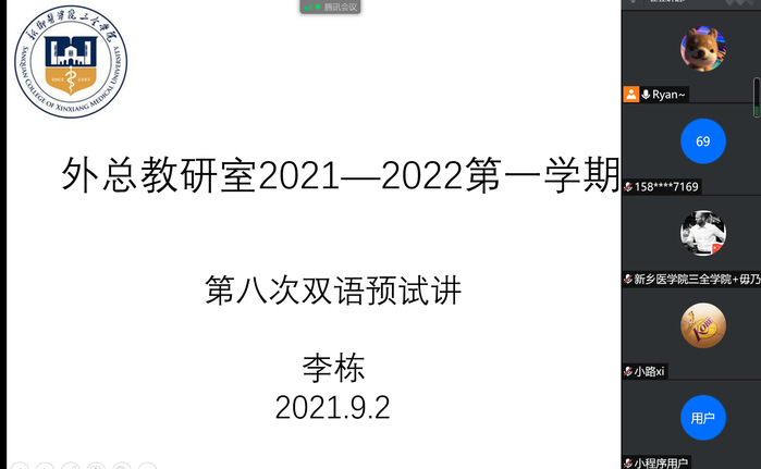 9月2日上午,外总教研室开展第9次线上集体备课及第8次双语预试讲活动,本次活动由外总教研室副主任朱光举主持,外总全体教师参加。