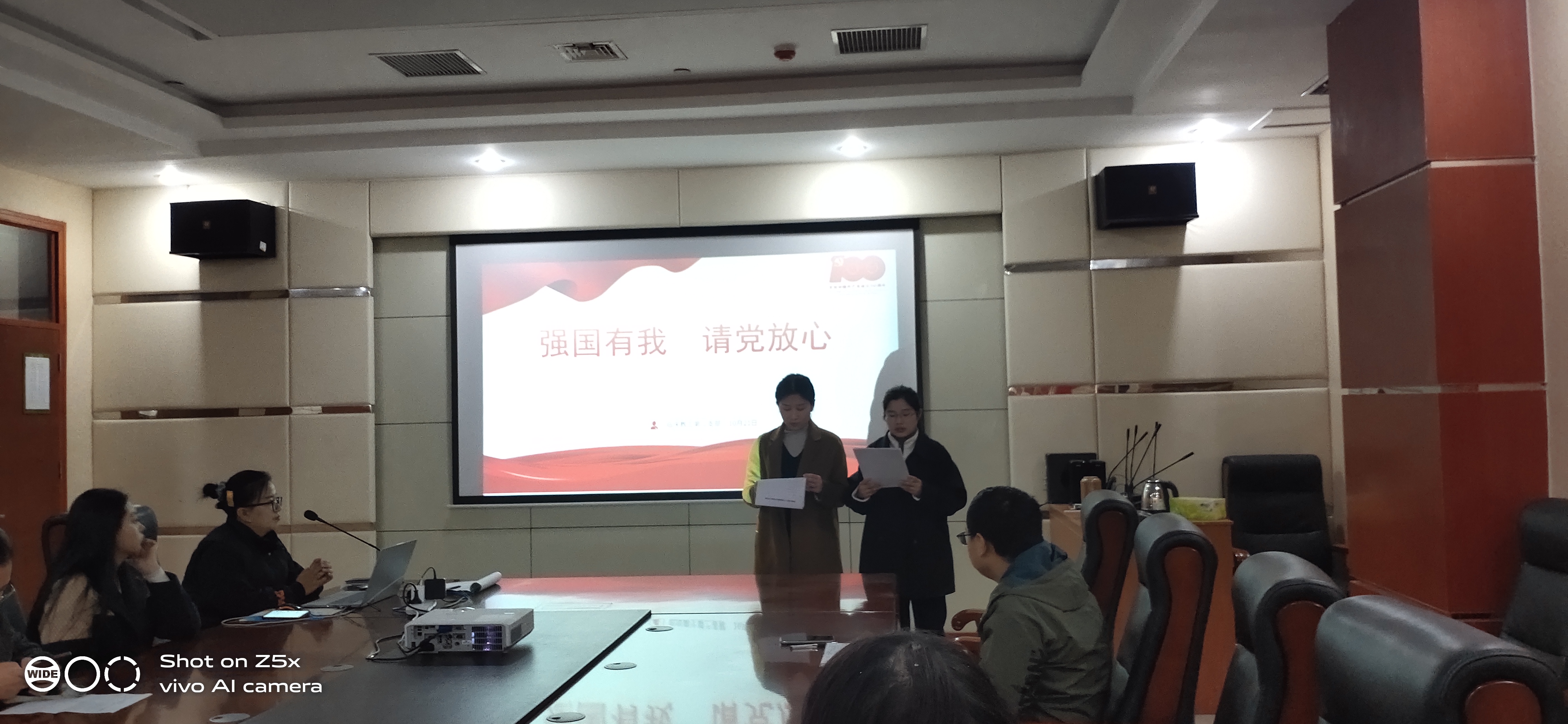 接着,积极分子于秉汝、朱冠华同志以诗朗诵——歌颂伟大的党,为中国共产党成立100周年献礼。声情并茂、铿锵有力的诵读了我们伟大的党百年征程。