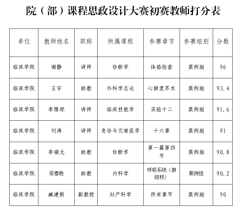 根据我校《新乡医学院三全学院课程思政建设实施方案》文件精神,按照新乡医学院三全学院第三届课程思政教学设计大赛方案要求,临床学院于10月28日下午通过腾讯会议平台开展本届课程思政教学设计大赛院系初赛,本次大赛共分课程思政教学设计组及课程思政优秀教学案例组,共计12名教师参加比赛,临床学院成立评审组,对参赛教师进行评审,现将成绩公布如下: