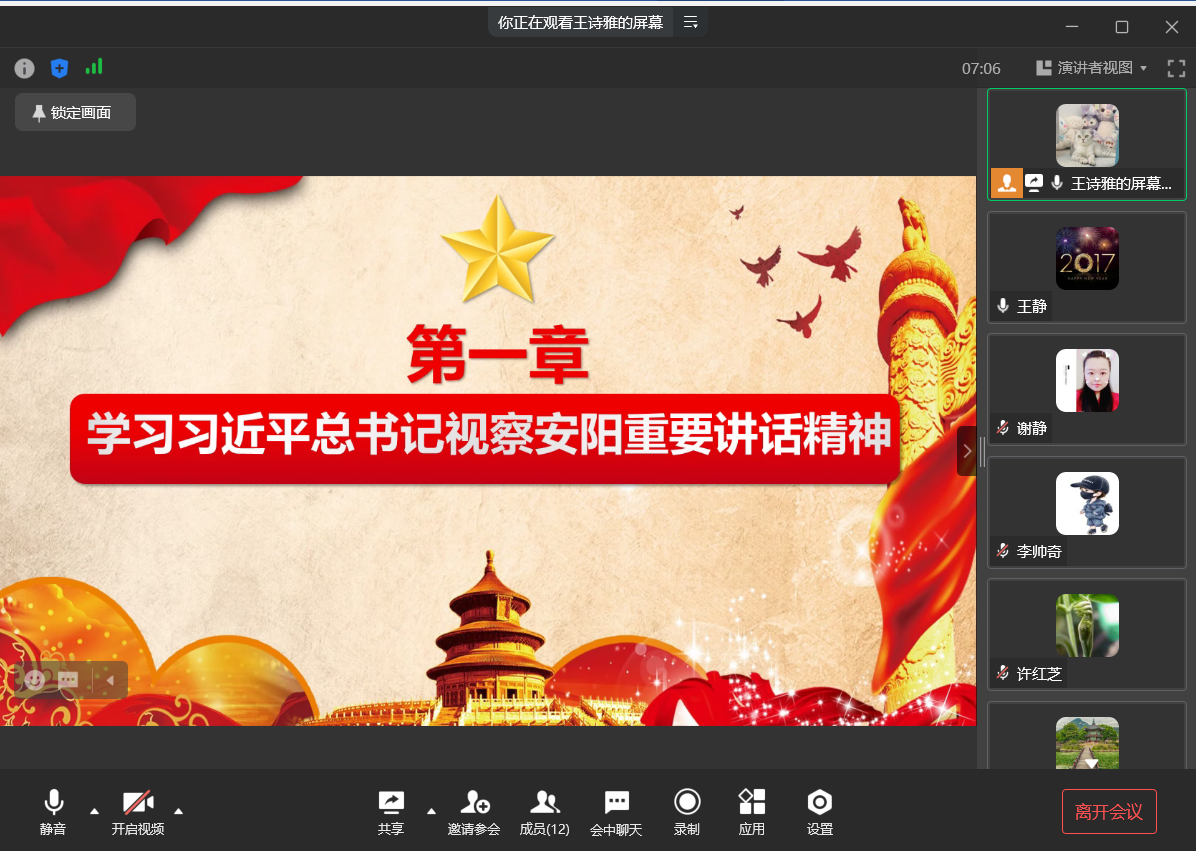 11月22日下午,诊断学教研室党支部通过企业微信在线上开展专题组织生活会,诊断学教研室党支部全体党员参加,王诗雅同志主讲。
