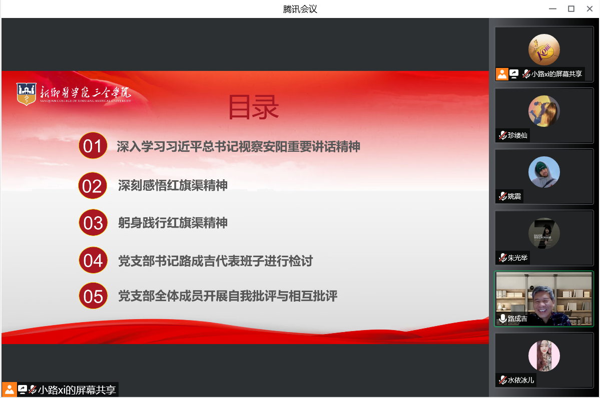 此次组织生活会的主题为“深入学习习近平总书记视察安阳重要讲话精神,大力弘扬红旗渠精神”。围绕此主题,组织生活会由三部分展开。首先,路臣桂同志带领全体党员深入学习习近平总书记视察安阳重要讲话精神。通过观看中央电视台《国家记忆》栏目播出的专题片《根脉——红旗渠精神》引导党员深刻理解把握“自力更生、艰苦创业、团结协作、无私奉献”红旗渠精神的丰富内涵,从红旗渠精神中汲取不竭精神动力,激发“越是艰险越向前”的英雄气概和“敢教日月换新天”的昂扬斗志。随后,党支部书记路成吉代表班子进行检讨。路成吉书记指出了目前支部存在的问题,并制定了相应的整改措施。会议的第三部分为党支部全体成员开展自我批评与相互批评,支部成员逐一发言,从自身实际情况出发,结合此次组织生活会的主题,深刻剖析了自身存在的问题。最后,路成吉书记进行总结发言。