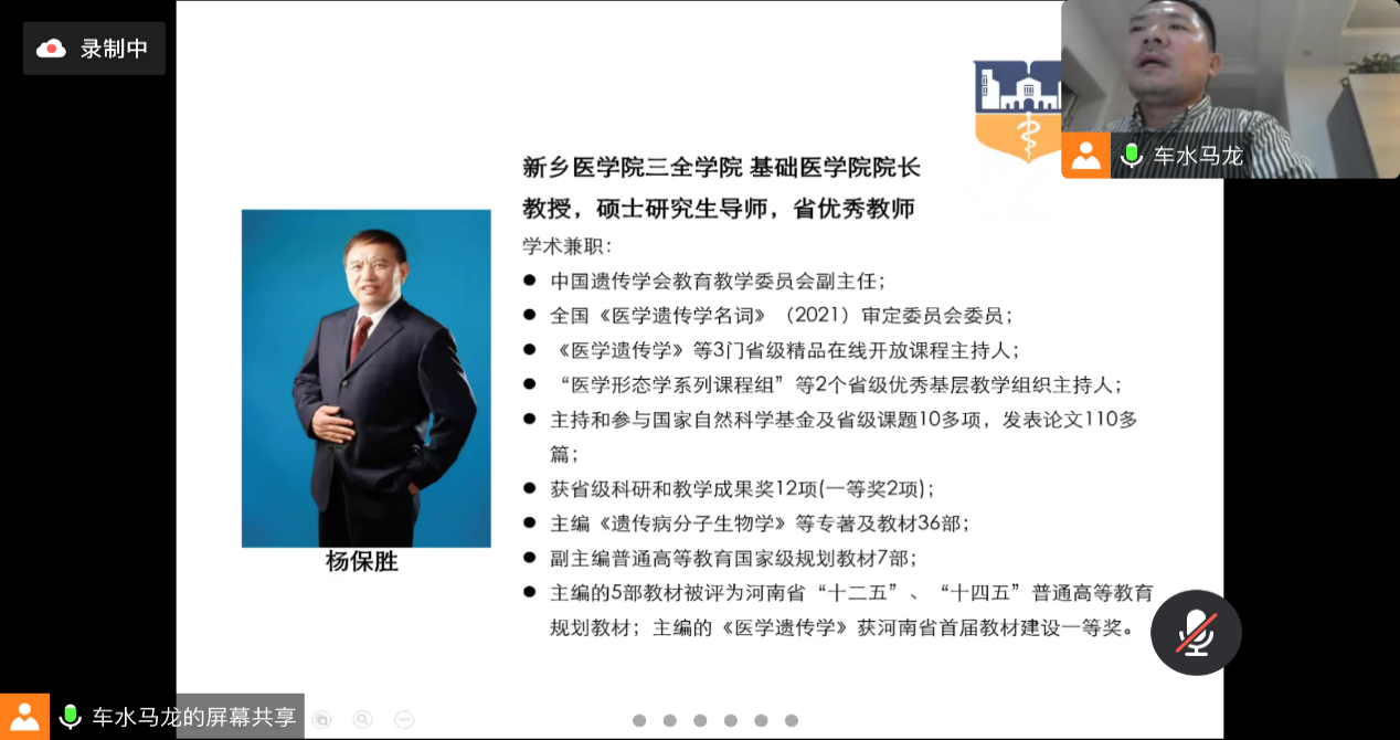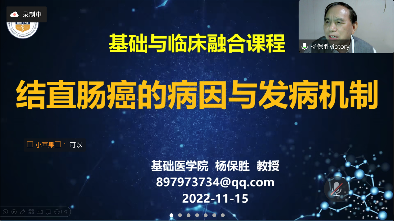 11月17日晚,临床学院利用腾讯会议平台,组织开展“基础与临床融合”线上示范性课程授课活动,本次课程以“结直肠癌的发病机制和治疗”为主要内容,分别邀请哈尔滨医科大学附属肿瘤医院韩宇教授和新乡医学院三全学院基础医学院杨保胜教授主讲。