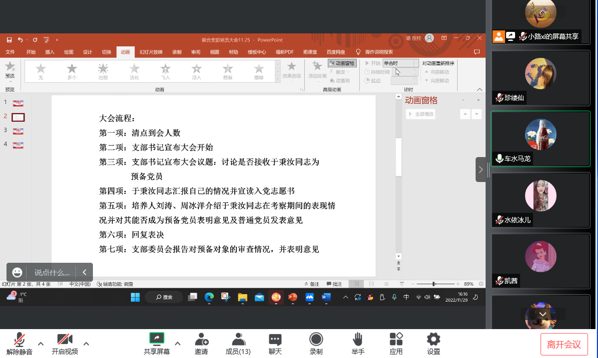 会议严格按照党员发展程序进行,于秉汝同志宣读《入党志愿书》,汇报对党的认识、入党动机、本人履历、现实表现以及应向党组织说明的其他问题;培养人刘涛,周冰洋同志先后介绍了培养情况并表明了是否同意发展的意见;支部组织委员介绍支部审查情况;与会党员对于秉汝同志是否符合党员条件发表意见。经表决,一致同意接收于秉汝同志为中共预备党员。大家纷纷寄语于秉汝同志,希望她将今天作为人生新的起点,以党员标准严格要求自己,提高政治理论水平,发挥自己的专长和优势,努力为师生服务,为学校健康稳定发展作出更大的贡献。