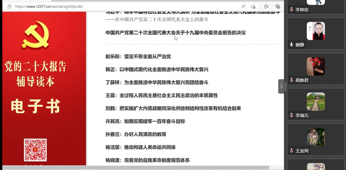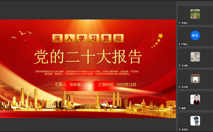 12月21日下午,诊断学教研室党支部通过企业微信平台召开线上支部党员大会,开展12月份政治理论学习,本次主题为“学习贯彻党的二十大精神,高举中国特色社会主义伟大旗帜为全面建设社会主义现代化国家而团结奋斗”,张新富同志主讲,支部党员全部参加。