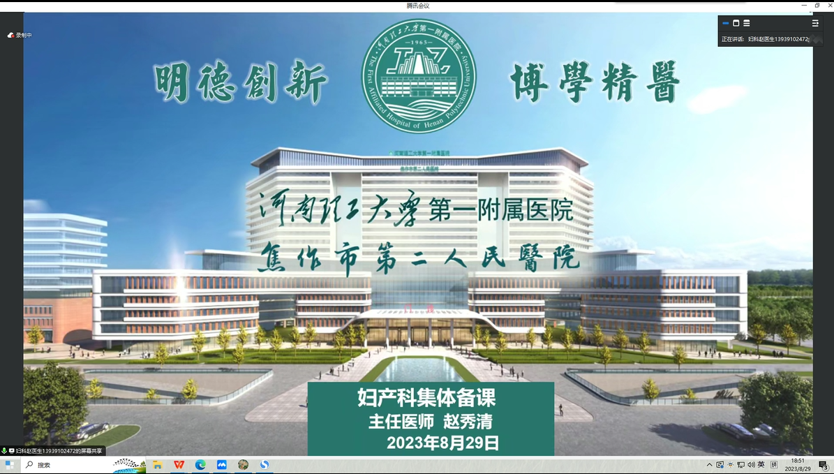 首先臧建新对课程中心进行简介,对教学内容进行详细说明,统一了教学过程。随后由焦作市第二人民医院即河南理工大学一附院妇产科赵秀清主任进行集体备课。首先她陈述了集体备课的形式、内容,着重强调了坚持五备、三统一,即:备教材、备课标、备教法、备学法、备教学手段,统一教学目标、统一教学重难点、统一教学进度。然后赵主任以子宫上皮内瘤变为例进行集体备课。最后,参会老师展开热烈讨论,本次教学活动圆满结束。