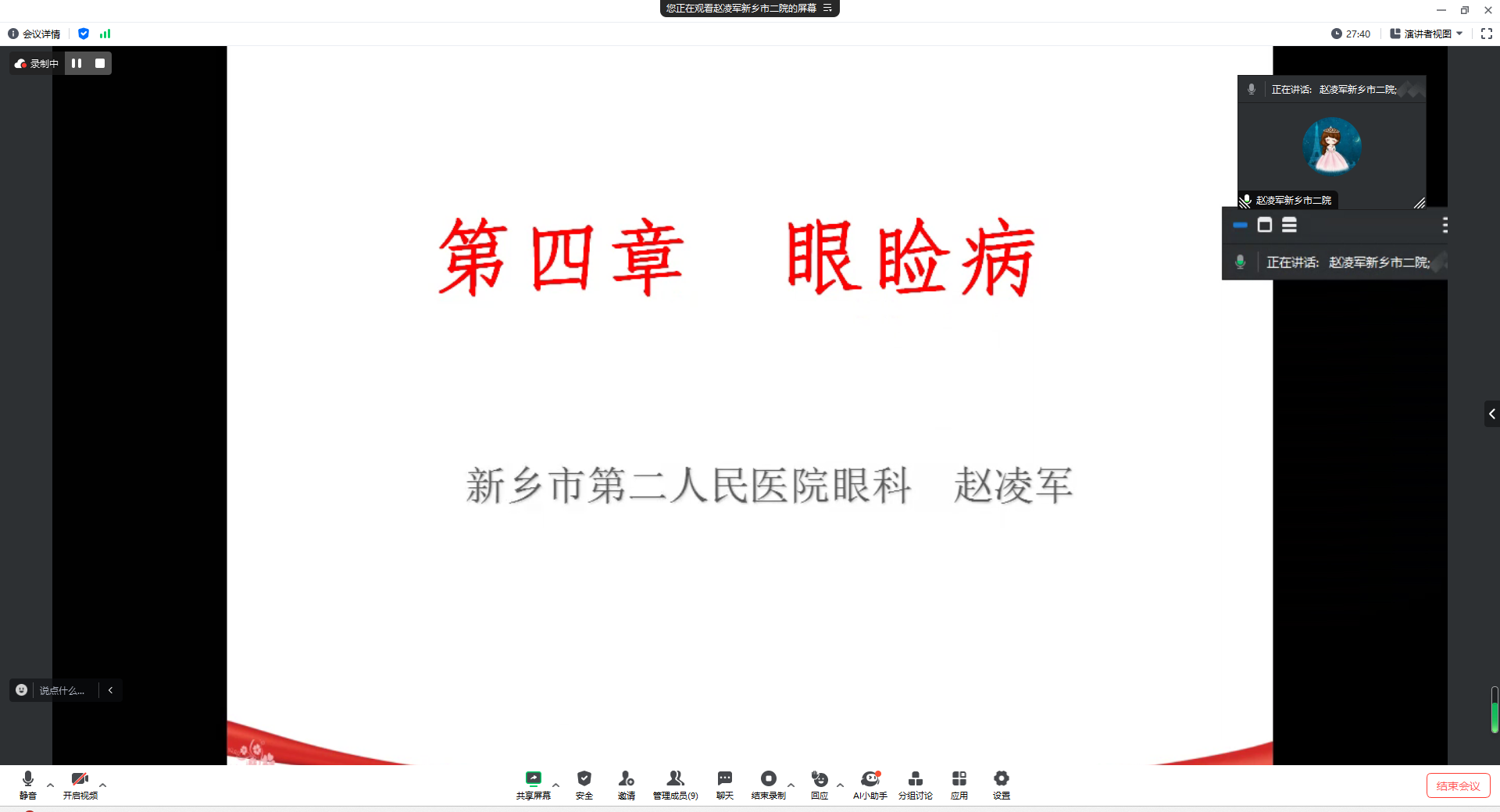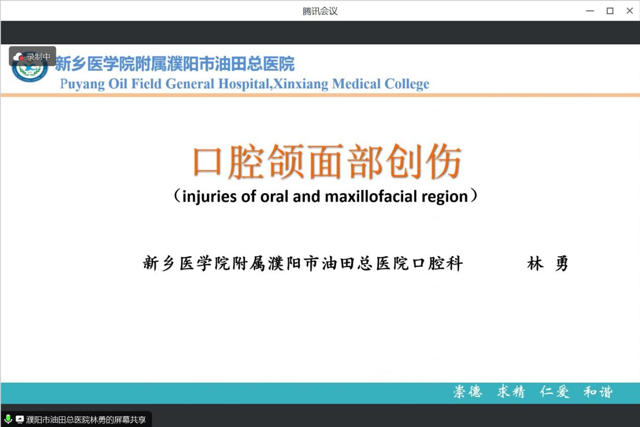 为加强课程和师资队伍建设,推动同质化教学进程,临床学院五官科学课程教学研究中心联合各教学基地举办2023-2024学年第二学期集体备课、示范性授课及教学研讨,特邀濮阳油田总医院口腔科主任林勇教授、新乡市第二人民医院眼科学副主任赵凌军、新乡市第二人民医院耳鼻咽喉头颈外科副主任阙振达三位老师主讲,各教学基地授课老师通过腾讯会议参与,本次会议由课程中心负责人李瑞元主持。