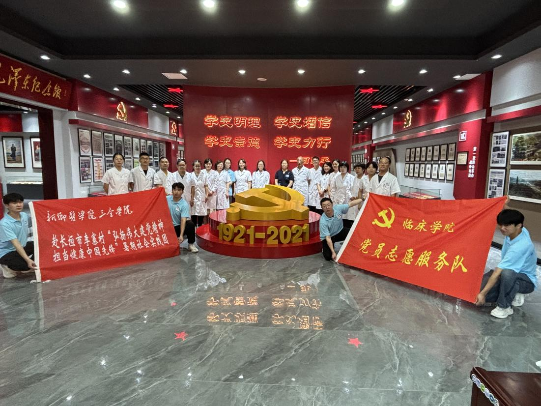 为庆祝中国共产党成立103周年,大力弘扬伟大建党精神,7月8日临床学院党总支组织开展形式多样的政治理论学习实践活动,在李寨村红色记忆馆内,依次参观8个主题板块,看着一幅幅厚重的历史图片、一张张泛黄的画报、一册册珍贵的文献,听着李寨村村委会成员李孟岭详尽叙述,党员们似乎身处那个激情燃烧的岁月,亲临波澜壮阔的革命活动,感怀革命先辈的爱国主义和革命英雄主义精神。