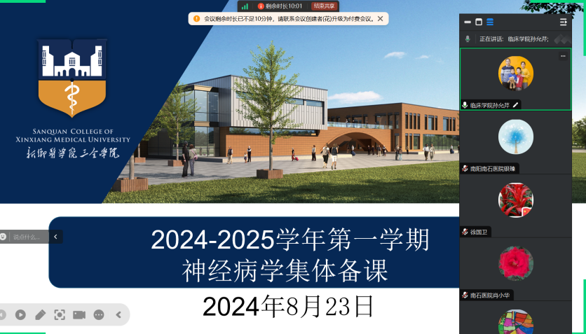 2024-2025新学年第一学期开课在即,为严格落实临床医学专业教学工作任务,适应现代医学教育改革模式,有效提高教学质量,根据学院工作安排,8月23日,临床学院内科学课程教学研究中心联合各教学基地,通过腾讯会议的方式,顺利完成本学期内科学(一)和神经病学课程的第一次教学集体备课。