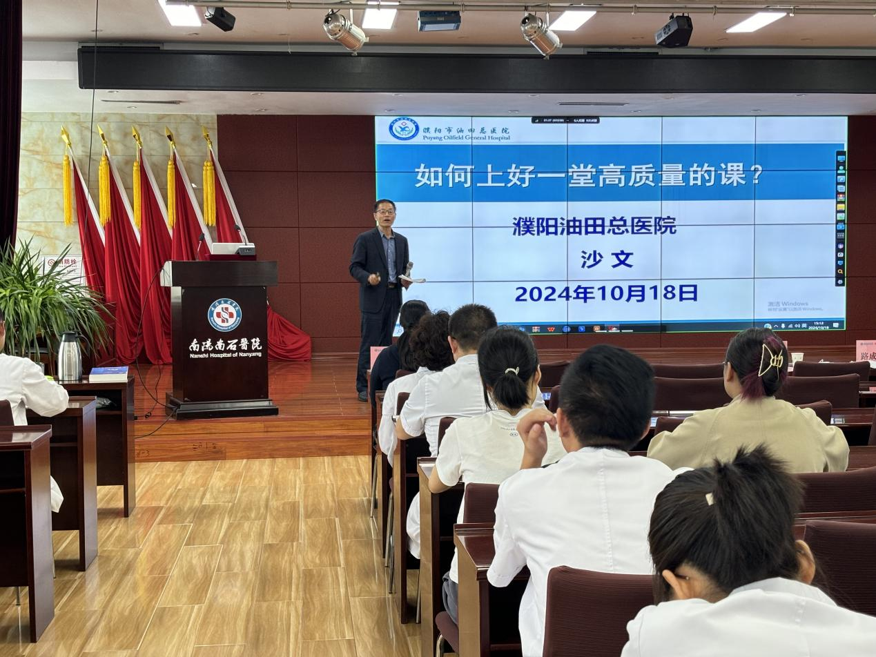 新乡医学院三全学院附属南阳南石医院临床学院教研室工作会议于2024 年10月18日隆重召开,南阳南石医院副院长彭兆龙、各教学教研室主任、副主任、教学秘书、12个教研室带教师资及科教科成员70余名教师,新乡医学院三全学院临床学院路成吉、基础医学院院长杨保胜、濮阳油田总医院外科学主任沙文应邀参加了此次会议,本次会议由科教科黄满利科长主持。