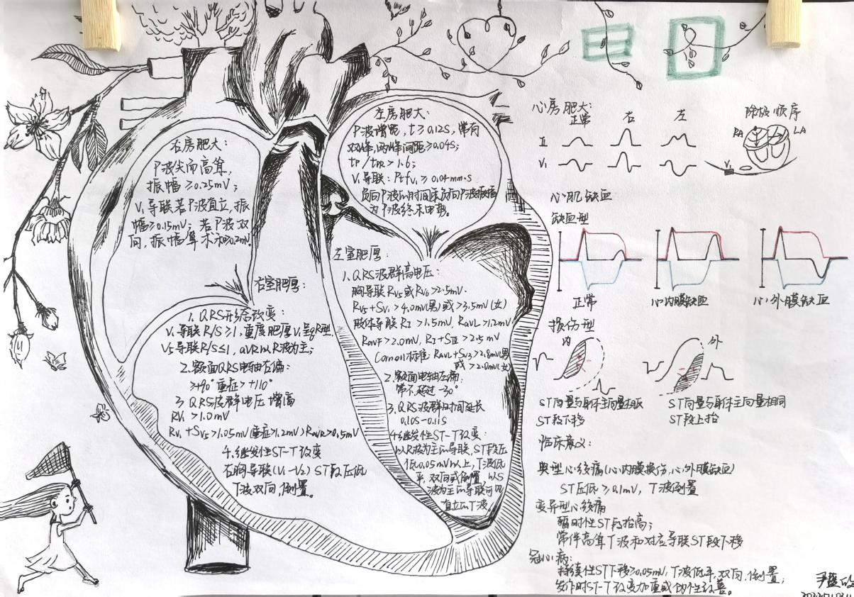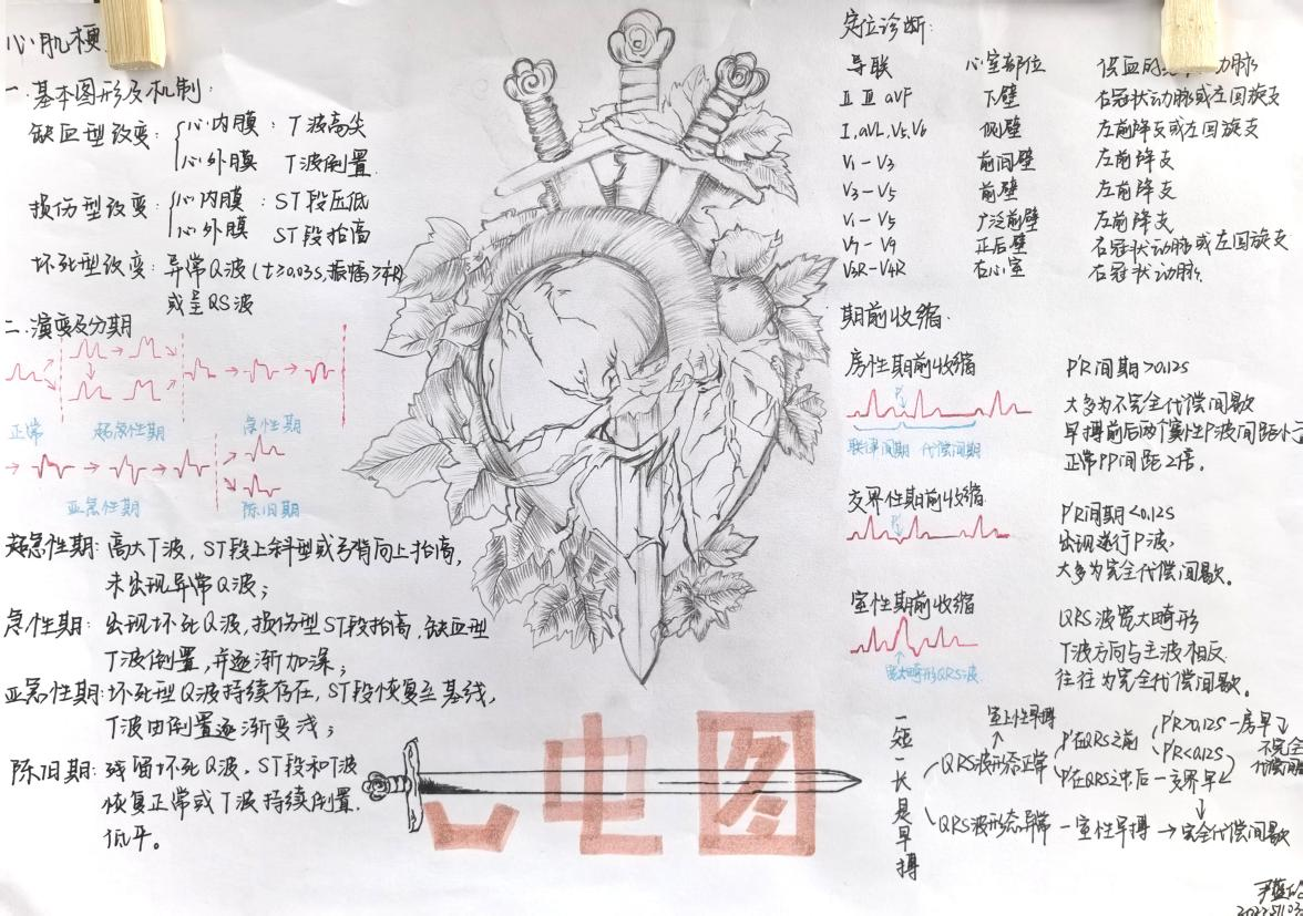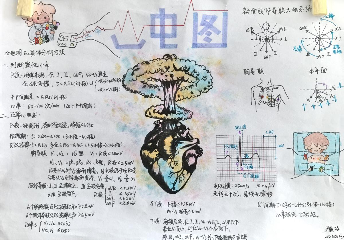 参赛作品以心电图分析流程为主线,融合正常波形解析、心律失常分类、心肌梗死动态演变等核心知识模块。学生通过口诀记忆法、流程图解、跨学科对比表格等形式,将抽象理论转化为可视化逻辑网络。参赛选手更是将学术与美学平衡,把优秀的绘画功底体现在作品中,使得作品不仅精准呈现心电图知识,更通过创新设计解决了教学中的重难点,部分思维导图可直接纳入教学案例库。