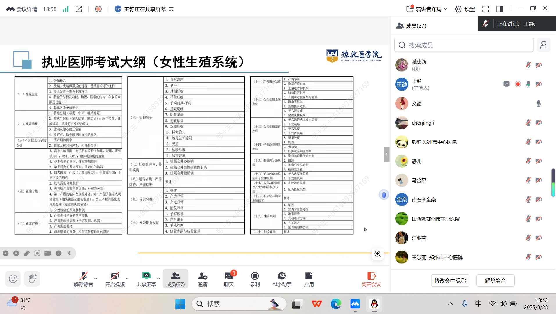 828日晚,妇产科学课程教学研究中心联合各教学医院,顺利开展了本学期的首次集体备课活动。本次备课依托腾讯会议平台,以线上形式进行,由妇产科学课程教学研究中心副主任王静主持,各教学医院的授课教师积极参与。