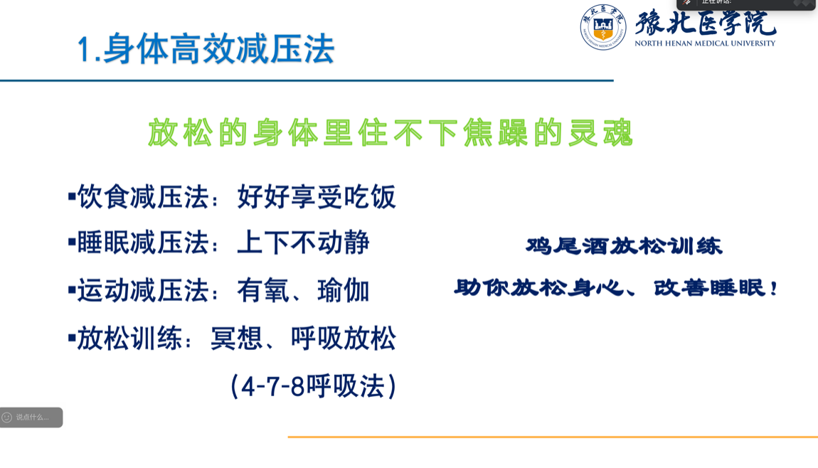 讲座尾声,黄静以“控制可控制的,放弃不可控制的”寄语收尾,鼓励学子把握当下、调整心情、尽力备考。此次线上心理讲座既为备考学子提供了科学的减压方法,也缓解了大家的焦虑情绪,为2026年考研考生注入心理动能。