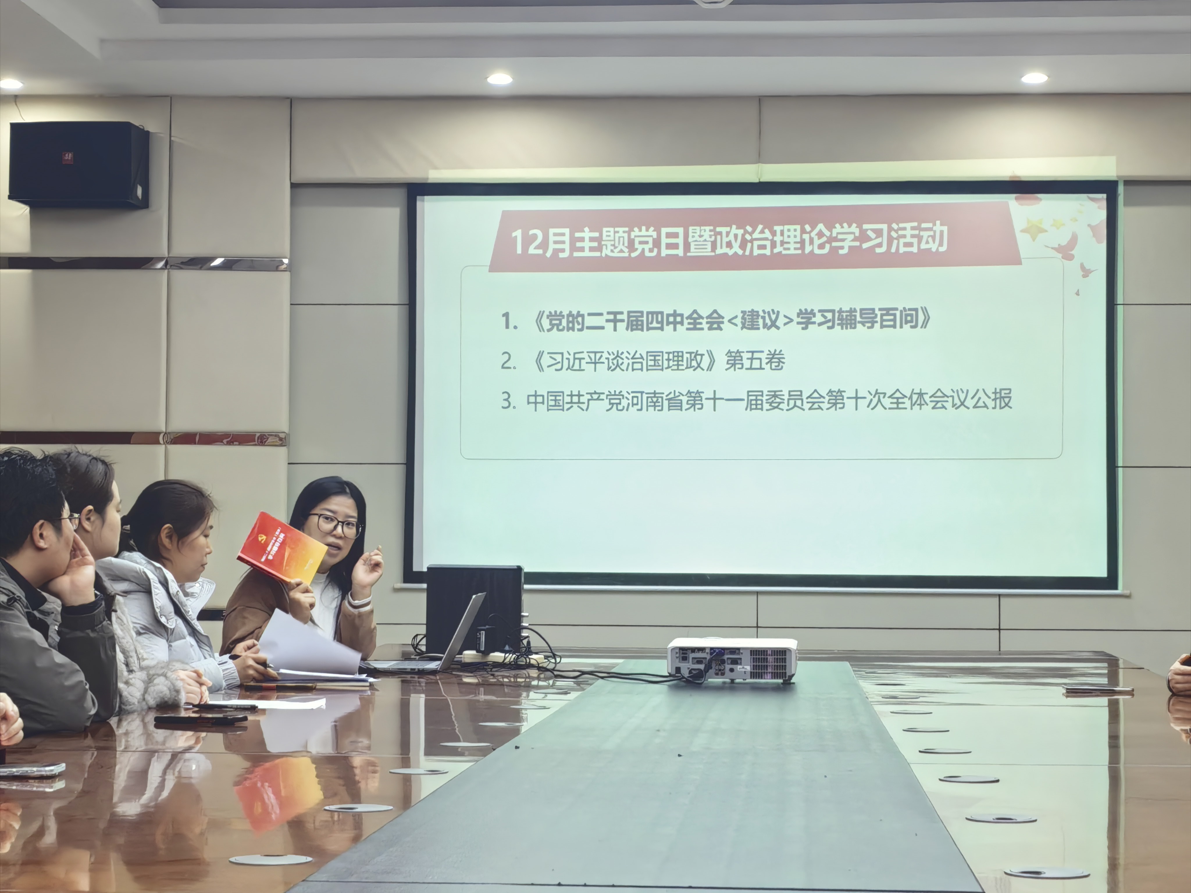 为深入学习贯彻党的二十届四中全会及相关会议精神,推动理论学习与教学科研实践深度融合,12月8日上午,课程教学研究中心党支部在综合楼二楼会议室召开“打好收官战,谋划十五五”12月主题党日暨政治理论学习活动。党支部书记王静担任主讲人,全体党支部教师党员参加学习。