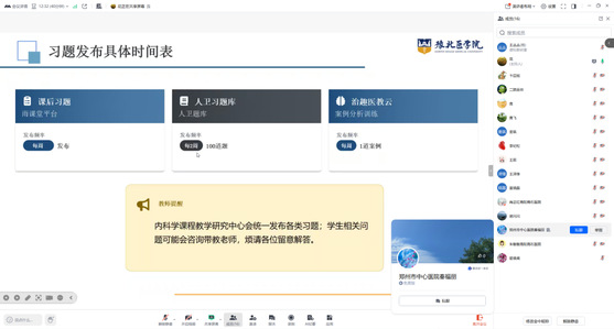 会上,课程中心就本学期教学各项规范要求作统一说明与明确。确定全面使用雨课堂开展教学,梳理了课前扫码签到、课中真题互动、课后作业巩固的教学思路;要求授课课件统一采用学校指定模板,同时明确课后习题将通过雨课堂、人卫习题库、治趣医教云三大平台分层发布的具体安排。此外,会议还详细解读了本学期成绩构成细则,清晰划分课堂成绩、课后习题、案例分析、期中及期末考试的占比与考核形式,确保成绩评定科学规范。