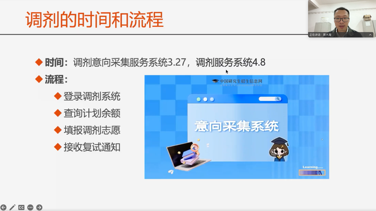 本次讲座以“把握机会,开启新征程”为主题,原大海围绕临床医学类专业调剂核心要点,从考研调剂定义、调剂种类、时间流程、前期准备、实操方法及常见问题六大方面,进行系统性、针对性的线上讲解。讲座伊始,原大海明确考研调剂的官方定义与政策依据,指出调剂是教育部为考生提供的升学二次机会,引导学子正视调剂、放平心态,以积极状态做好调剂准备。