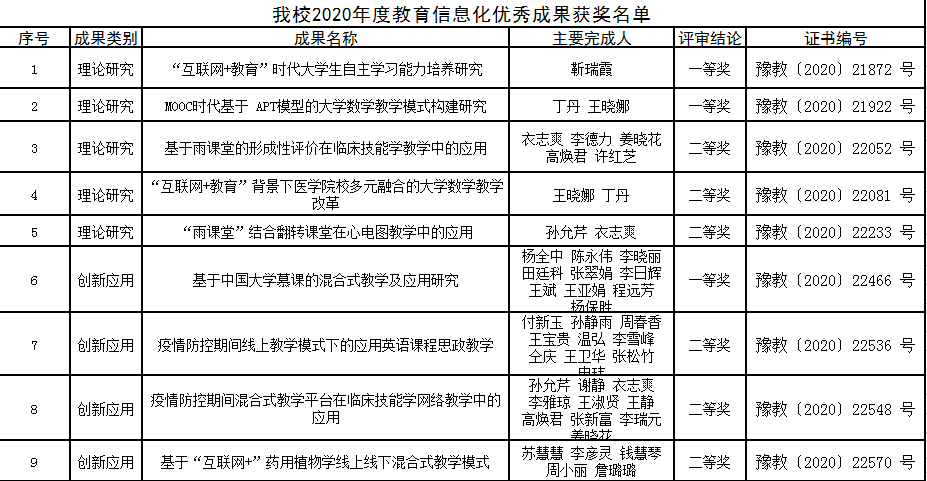 近日,河南省教育厅发布《关于公布2020年度河南省教育信息化优秀成果奖获奖名单的通知》(教科技〔2020〕332 号 ),我校经过院系遴选,学校审核推荐,荣获9项教育信息化优秀成果,其中理论研究成果获得一...