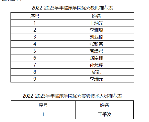 2022-2023学年临床学院优秀教师、优秀实验技术人员评选推荐结果公示
