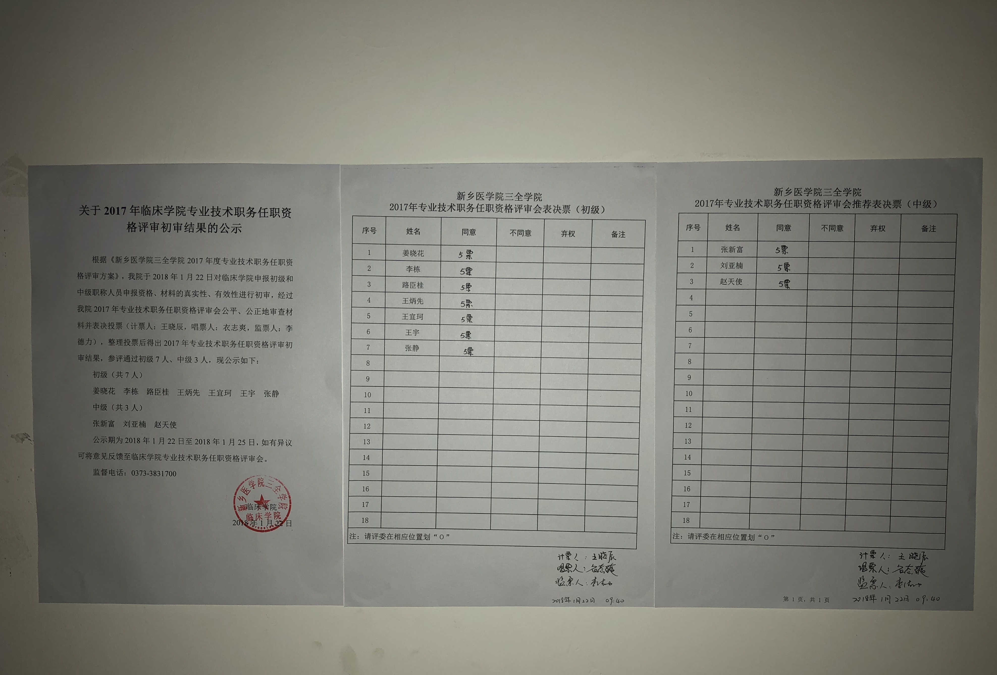 根据《新乡医学院三全学院2017年度专业技术职务任职资格评审方案》,我院于2018年1月22日对临床学院申报初级和中级职称人员申报资格、材料的真实性、有效性进行初审,经过我院2017年专业技术职务任职资格...