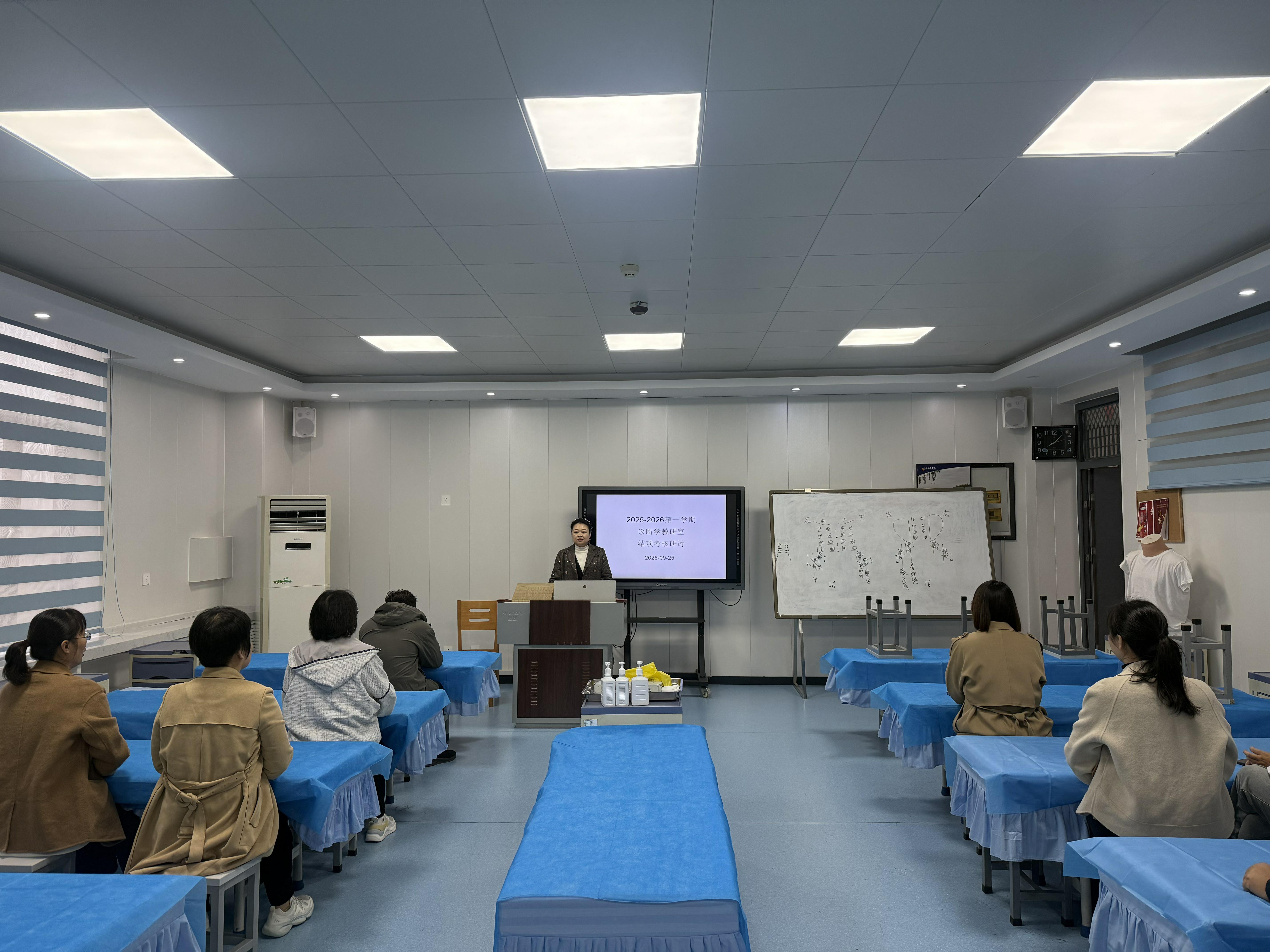 9月25日上午,诊断学教研室在问学楼4楼第四实验室召开2025-2026学年第一学期教学结项考核研讨会,旨在为后续教学优化指明方向。活动由教研室副主任谢静主持,全体带课教师参与。阶段性结项考核旨在检验学...