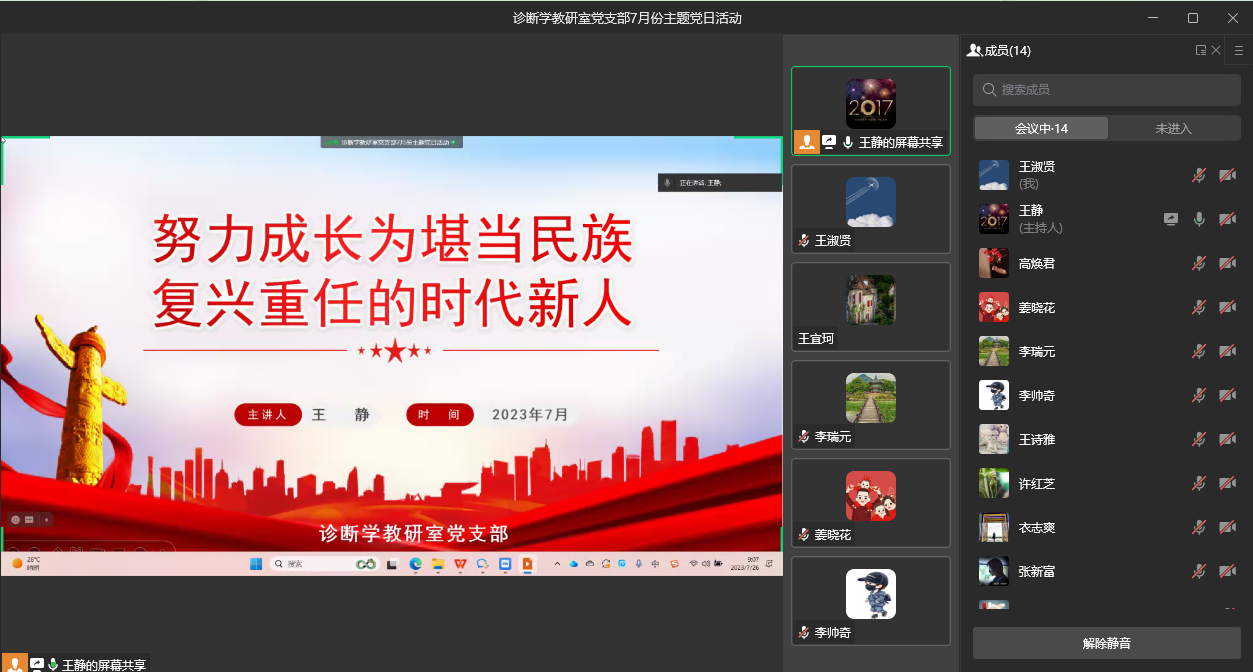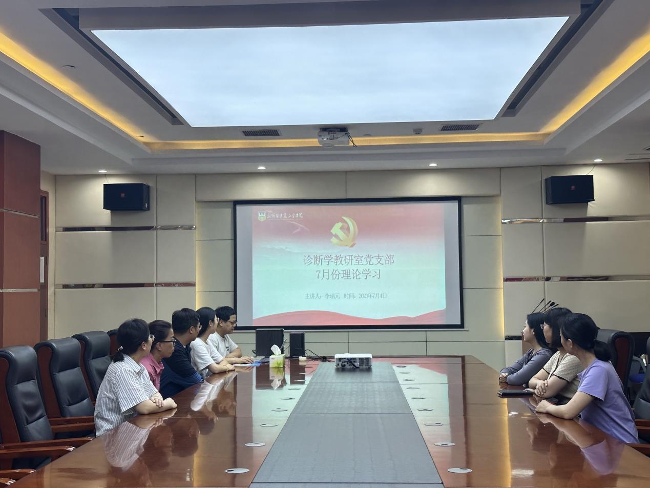 根据学校指示安排,诊断学教研室党支部于7月25日上午开展7月份主题党日活动。王静主持,全体党员参加。首先,王静介绍本月主题党日活动内容,包括《学习习近平总书记关于党的自我革命重要论述》;《习近平...