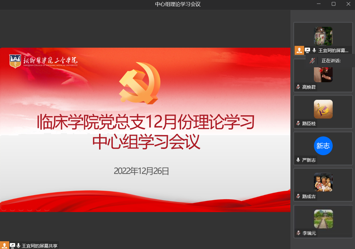 12月26日,临床学院党总支通过企业微信在线上召开理论学习中心组12月份专题学习,临床学院党总支中心组全体成员参加理论学习。会议由党总支书记许红芝同志主持。本次学习会议分四部分进行:一、许红芝同志...
