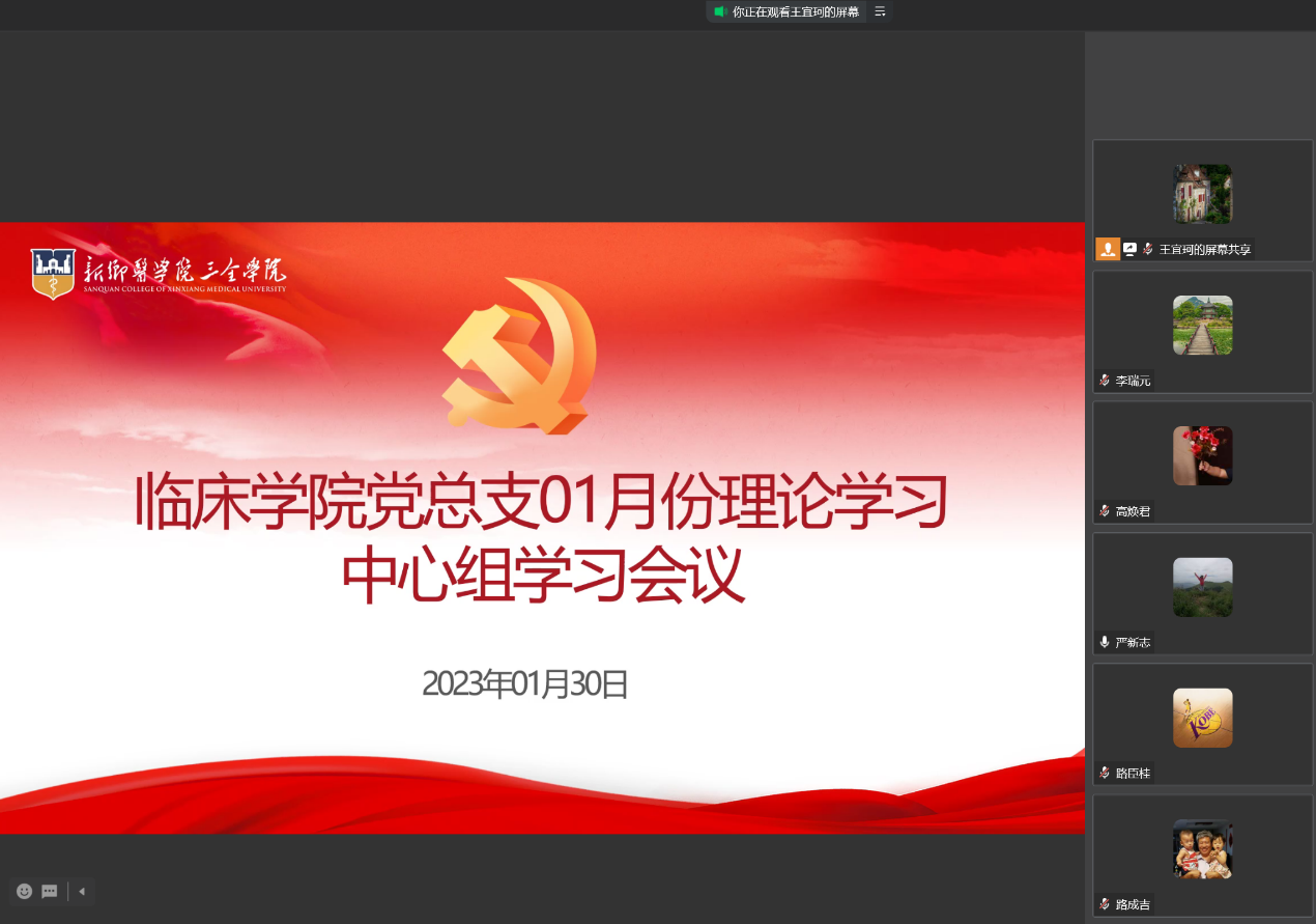 1月30日,临床学院党总支通过企业微信在线上召开理论学习中心组1月份专题学习,临床学院党总支中心组全体成员参加理论学习。会议由党总支书记许红芝同志主持。本次学习会议分四部分进行:一、许红芝同志领...