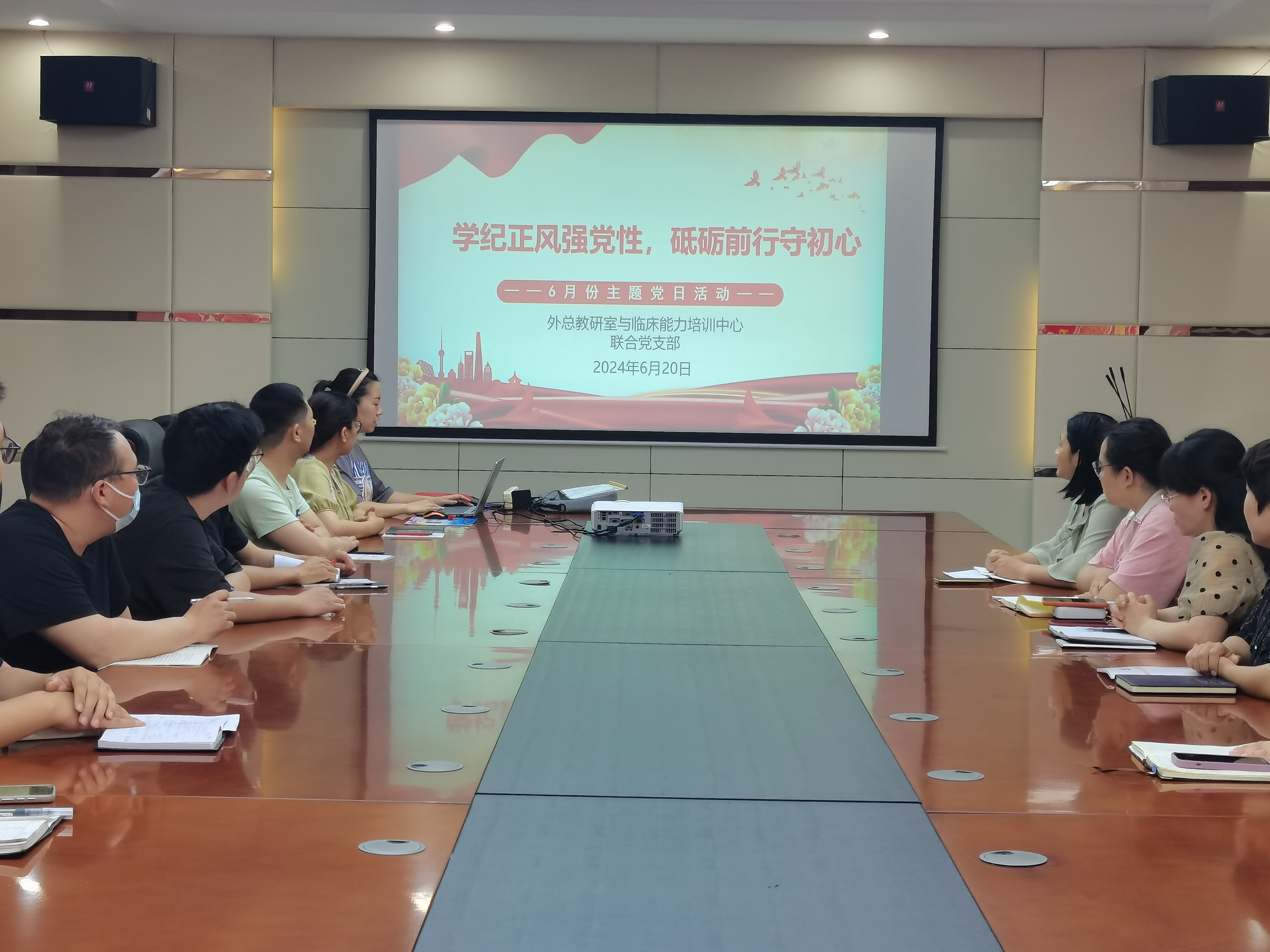 6月20日上午,外总教研室与临床能力培训中心联合党支部在综合楼二楼会议室举行6月份主题党日活动,本次活动主题为“学纪正风强党性,砥砺前行守初心”。党支部全体党员参加。活动伊始,党支部全体成员集体...